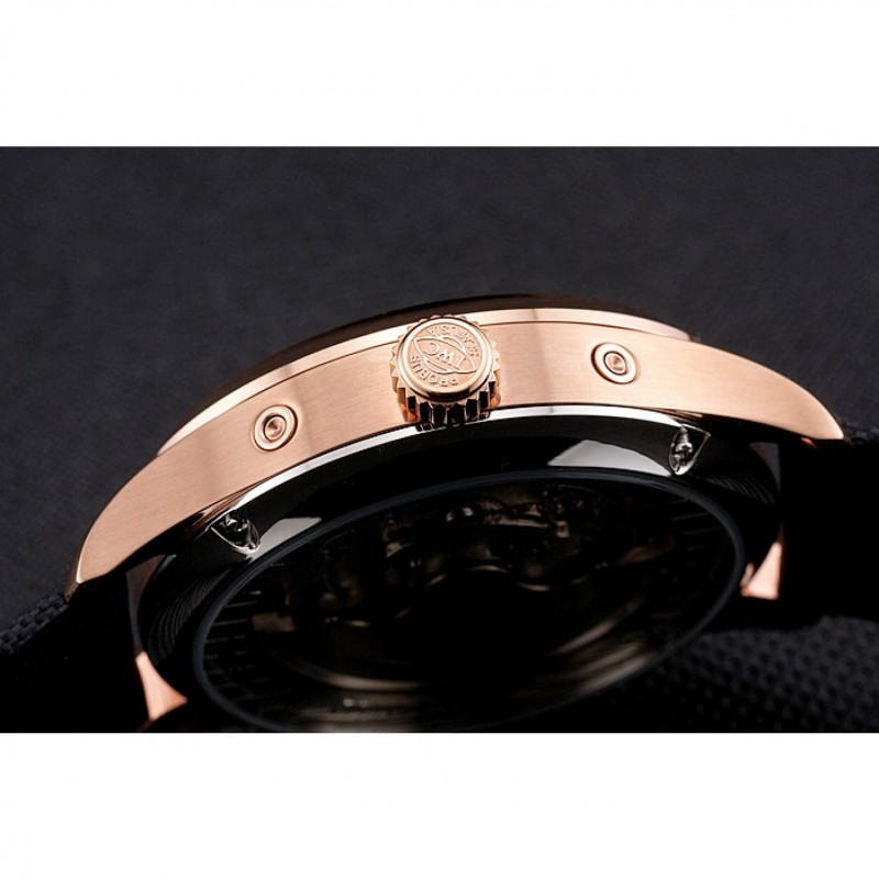 Este reloj cuenta con una imponente caja de acero inoxidable bañada en oro rosa de 18 quilates, que no solo le aporta un toque de lujo, sino que también asegura durabilidad. El fondo transparente revela los componentes mecánicos, mientras que la corona de corte con el logotipo de IWC está elegantemente grabada en oro rosa. La combinación del dial blanco y la bisel de oro rosa proporciona un contraste atractivo, complementado por la correa de textil negro que refuerza el estilo moderno de este reloj. Este reloj es una opción ideal para quienes buscan selecciones de relojes IWC falsos que no comprometan la calidad por el precio.